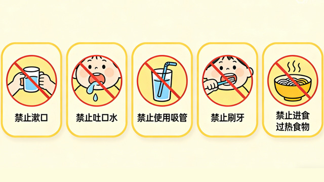 禁止:6小时内不漱口,当日不刷牙(刷牙可能使创口感染发炎)。勿用舌头舔、吸吮创口,以免负压引起出血。